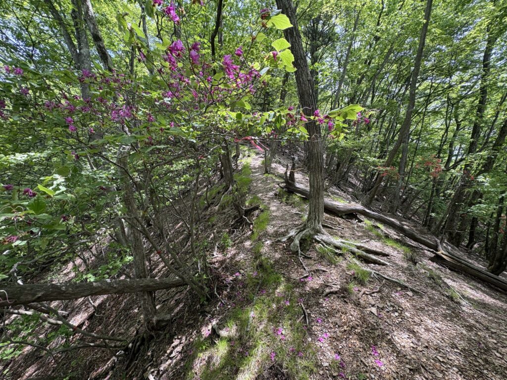 分岐から約20分で尾根上に到着しました。この尾根は南牧村と上野村との境界線で、尾根の右側は上野村です。ここからは傾斜も緩くなり、登山道もぐっと歩きやすくなります。5月下旬ですが、まだツツジも咲いていました。10分ほど尾根上を登ると、「マル」と書かれた標識が立つピークに到着。ここは標高が1220メートルと烏帽子岳山頂より高く、「シラケ山」へ至る登山道が分岐しています。木々の間からは、烏帽子岳の山頂もチラチラと見られます。