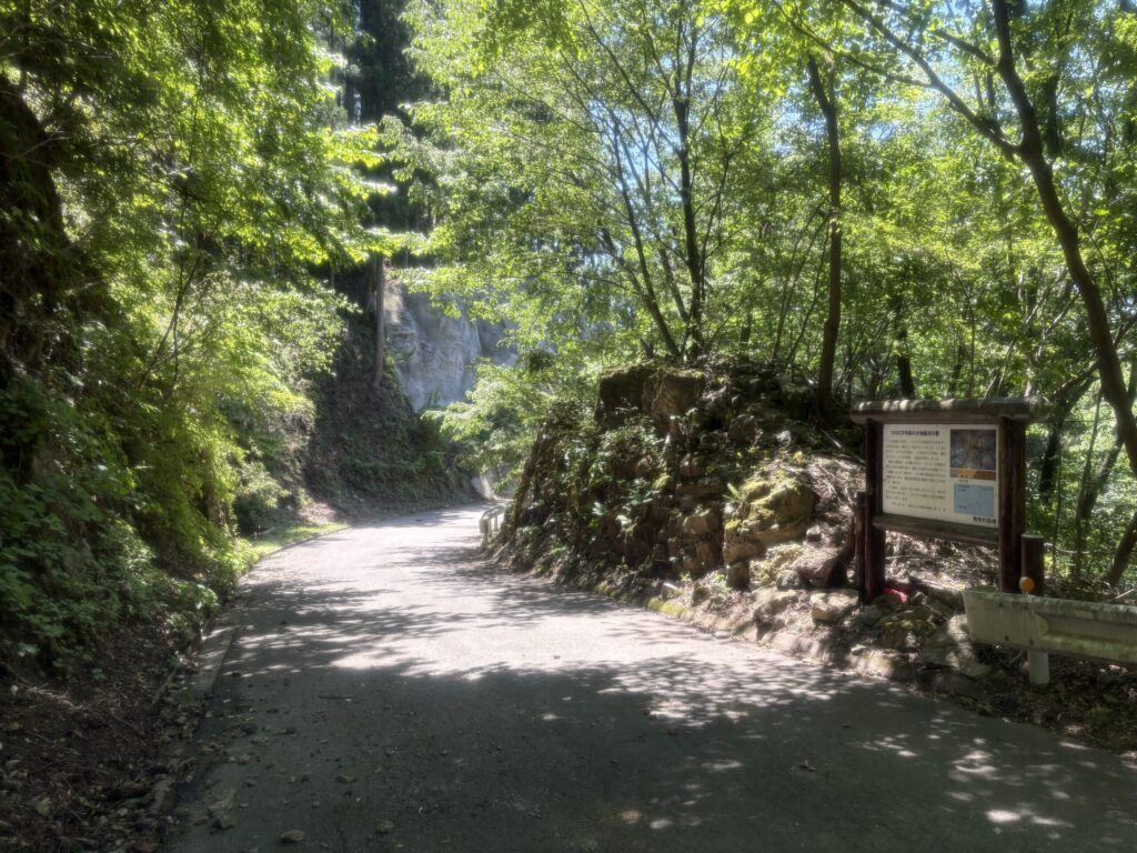 なぜこの場所を訪れたかといえば、最近、登山をしていて地層が露出した岩を見ることが多く、南牧村の地質や地層に興味を持ったため。それと林道の法面工事で、「陥没の壁」が見られなってしまうと聞いたからです(工事はR8年度の予定)。看板の説明によれば、この壁は1000万年前に発生した大地陥没の跡とのこと。右側が古い地層、左側が陥没後に堆積した新しい地層です。説明がなければ、一般人には絶対見つけられません。